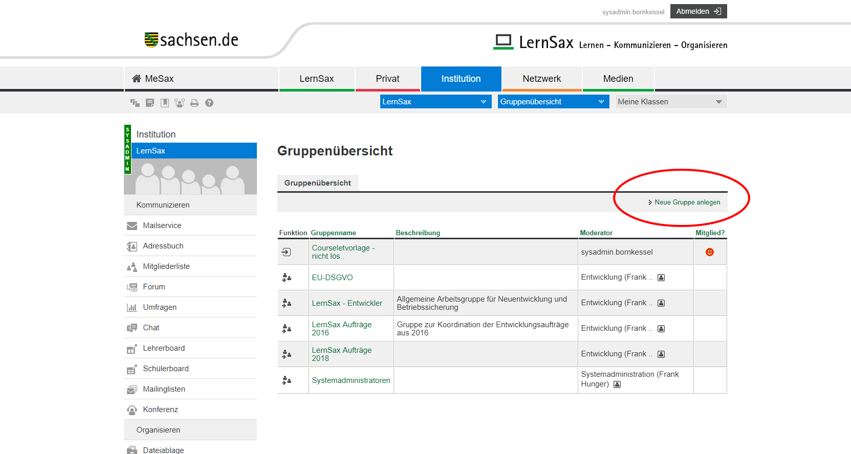 Bitte beachten: Diese Funktion hat nichts mit den Netzwerkgruppen unter dem Tab "Netzwerke" zu tun. Diese sind für die Zusammenarbeit mehrerer Einrichtungen vorgesehen. Zugang zu den hier erstellten Gruppen erhält man unter dem Tab Institution und dort in den Gruppen- bzw. Klassenwählern und der dort erhaltenen Gruppen- bzw. Klassenübersicht.