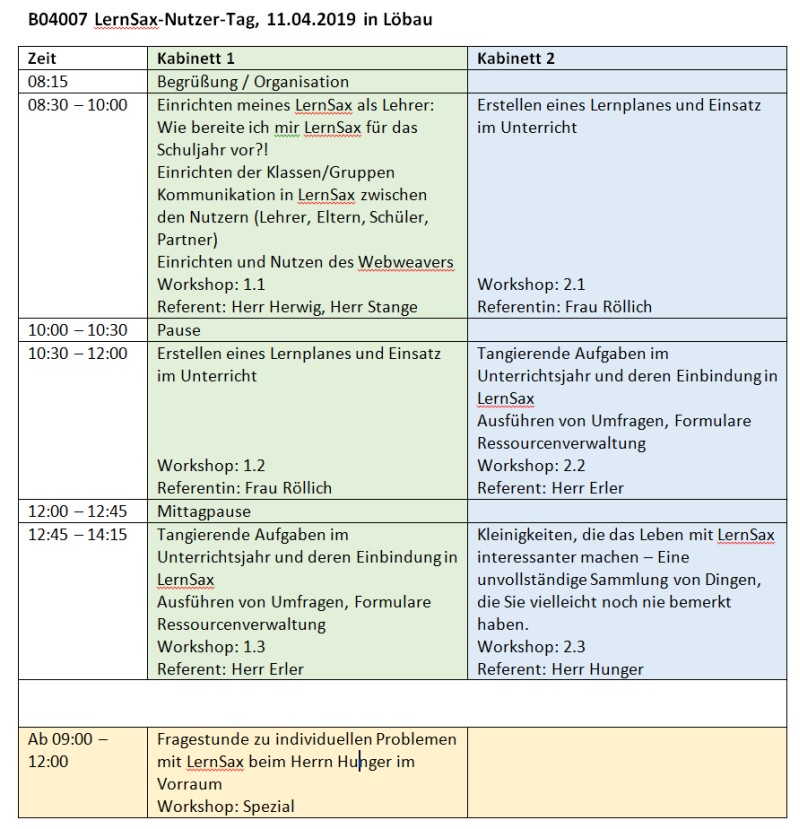 Viele Schulen in Sachsen nutzen "LernSax" als schulische Organisations-, Kommunikations- und Lernplattform. Der Fachtag für LernSax-Nutzer stellt in einer sich wiederholenden Workshop-Abfolge erfolgreiche Konzepte vor und lädt zum Ausprobieren und Nachmachen ein. Die Veranstaltung gibt Anregungen zur Arbeit mit Schülern auf der Lernplattform. Basiswerkzeuge für webunterstützen Unterricht werden vorgestellt und praktisch erprobt und so der regelmäßige Gebrauch der Lernplattform angeregt.