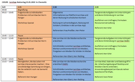 LernSax-Fachtage finden im Rahmen der regionalen Lehrerfortbildung statt und thematisieren in einer Reihe von thematischen Workshops Fragen rund um Funktionen und Nutzungskonzepte von LernSax. Der "LernSax-Nutzer-Tag" legt den Schwerpunkt auf den alltäglichen Einsatz von LernSax in den üblichen Nutzungsszenarien Lernorganisation und Lernunterstützung.
