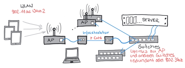 Um den Datenstrom vom Accesspoint bis zum Server nicht zu bremsen, müssen auch die verkabelte Infrastruktur und die Switches für diesen Datendurchsatz ausgelegt sein. Durch die Norm 802.3bz (Multi-Gigabit, nBase-T) können auch über ältere Infrastrukturen mit Komponenten nach CAT5e oder CAT6 bis zu 5 Gbit/s übertragen werden. Dazu müssen nur die Switche über die entsprechenden Ports verfügen.